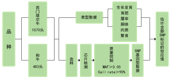 国家肉牛遗传评估中心构建了我国第一个肉牛基因组选择参考群,其中包括西门塔尔牛1570头,和牛483头。数据包含生长发育、育肥、屠宰、胴体、肉质、繁殖6类87个重要经济性状。
